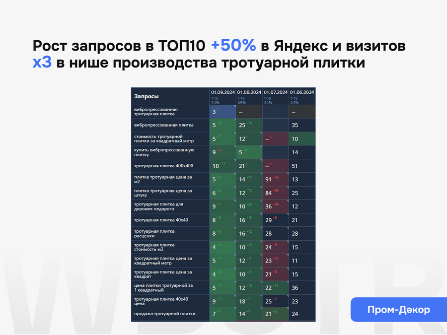 На основе фактической динамики пересматриваем приоритеты: усиливаем перспективные страницы, дорабатываем слабые разделы, корректируем структуру и контент там, где сайт недобирает результат.